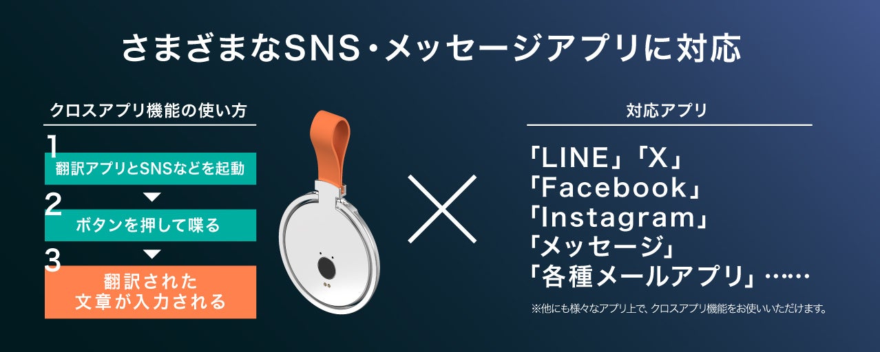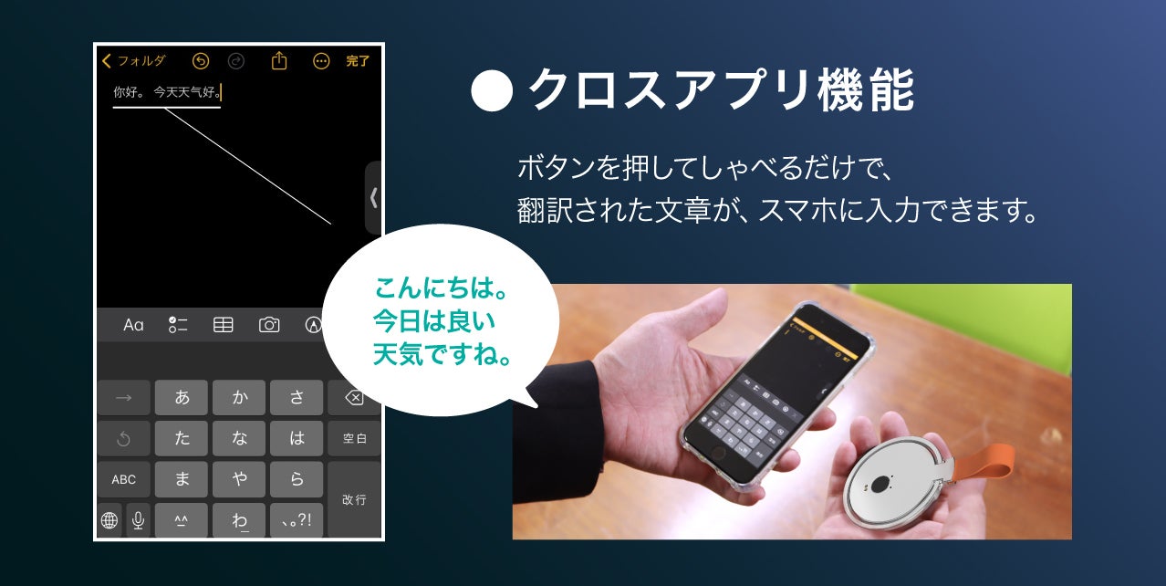「クロスアプリ機能」は、スマートフォンで別のアプリケーションを利用している際に、「Trans Plate」のボタンを押しながら発話をすることで、その内容が翻訳された文章を音声入力をすることができる機能です。