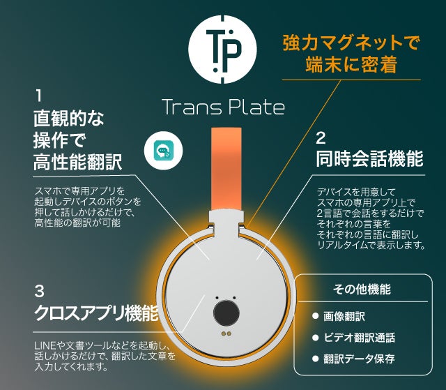 「Trans Plate」は、スマートフォンと連携して使用する、OpenAI社製の高性能翻訳エンジンを搭載した、スマートな翻訳機です。専用アプリを介し、デバイスのボタンを押して言葉を発するだけで行える高性能翻訳を始め、「同時会話機能」や「クロスアプリ連携」「音声認識からの文字起こし」など、翻訳をさらに便利にする機能が多数搭載されています。