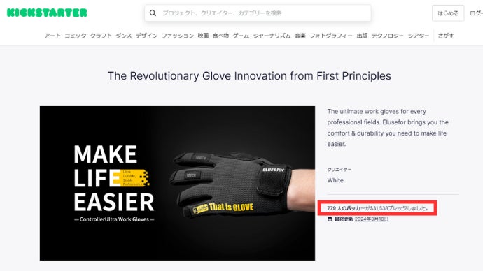 「eLuseforグローブ」は、アメリカのクラウドファンディングサイトKickstarterで779人、総額約$31,538から支援を集めるに至りました、注目の作業手袋です。