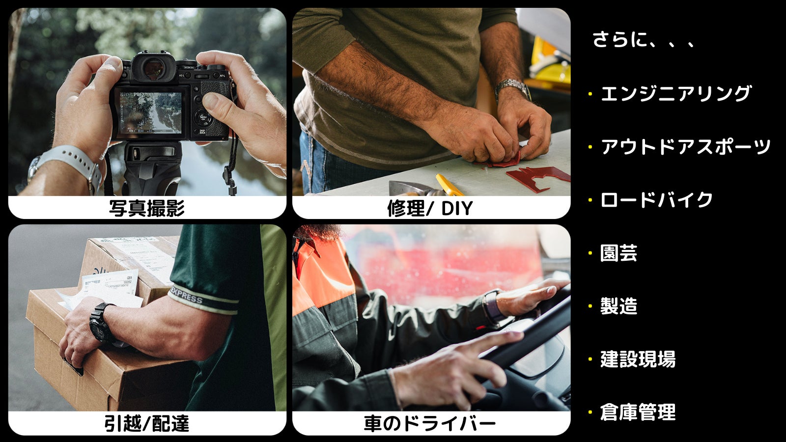 写真撮影、修理/DIY、引越/配達、車のドライバー、エンジニアリング、アウトドアスポーツ、ロードバイク、園芸、製造、建設現場、倉庫管理など