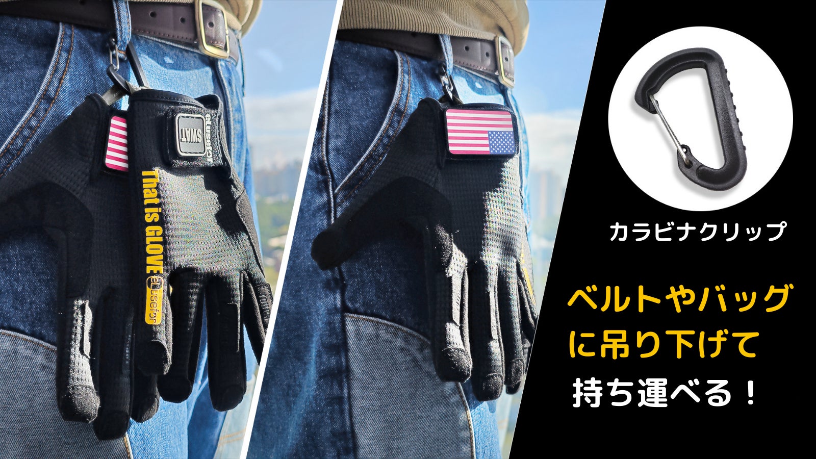 手袋を使用しない時はベルトやバッグに吊り下げて持ち運びましょう。