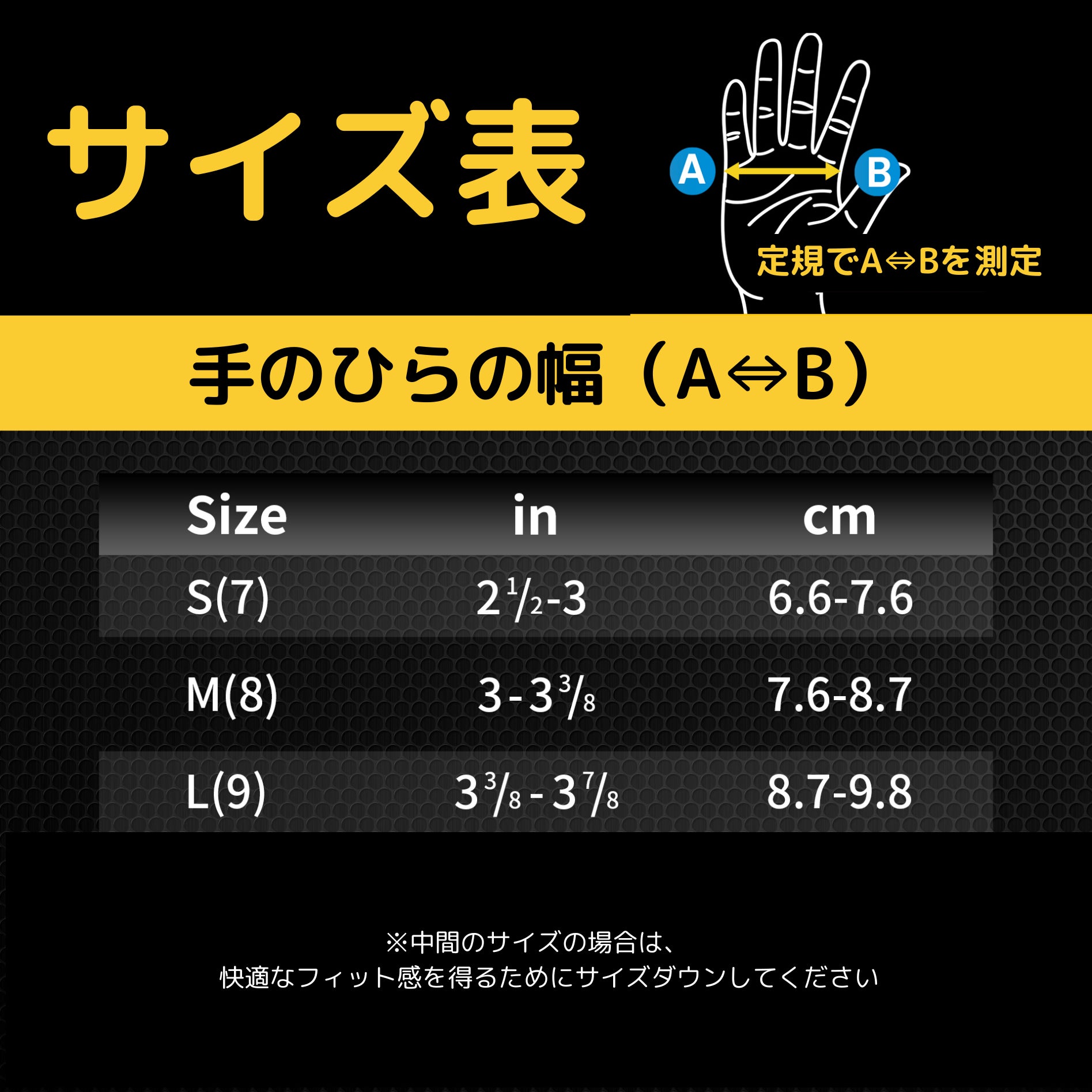 A.指は閉じて平らにします。サイズガイドに従って、手のひらの中央を測定してください。