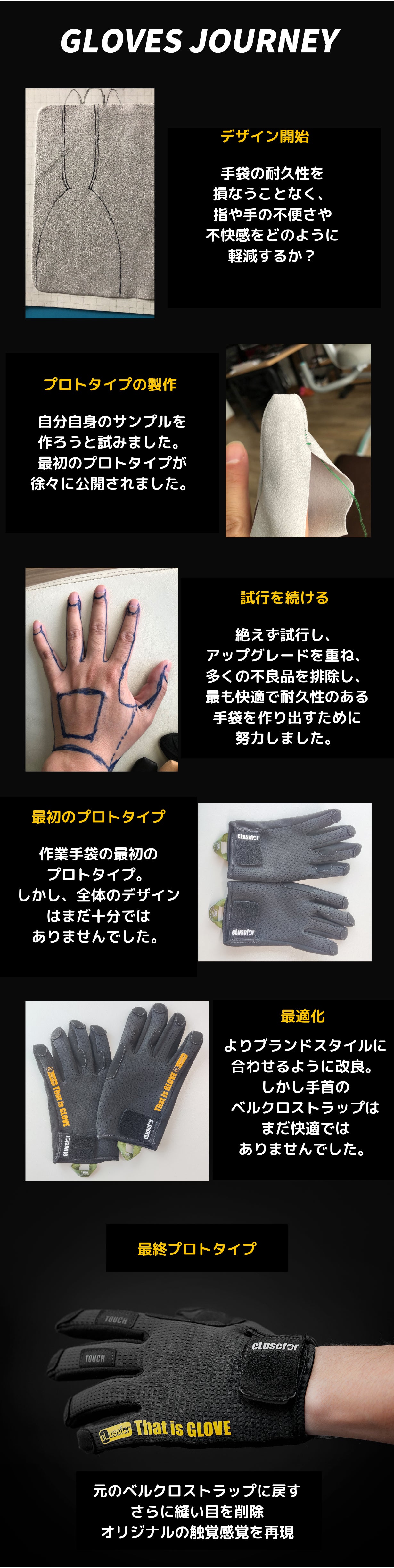 現在、日本にはまだ機能性に優れたシームレスな作業手袋は少なく、また、背面の通気性やタッチスクリーン機能をも併せ持つものはほぼないでしょう。私自身DIYが好きでこのような商品を長年探しており、ちょうどこの新製品を見つけたため、『これだ!』と思い、海外から購入しました。この作業手袋を使いはじめたことで、作業がより快適にスマートになったことを実感したため、この手袋をもっと広く多くの日本の方に知ってもらえたらいいなと思い、eLuseforにお声がけさせて頂きました。