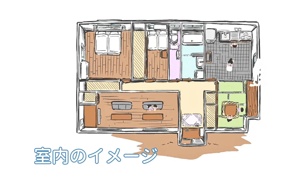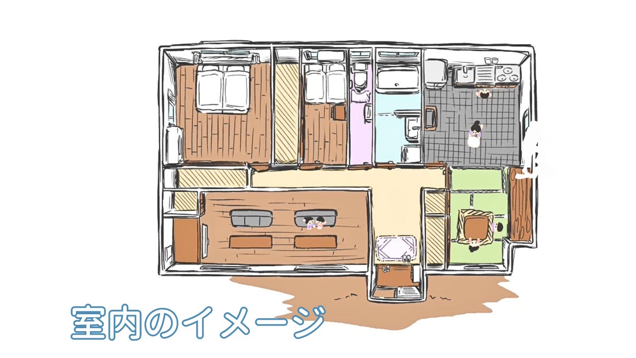 宿泊棟の中にはリビング、ダイニングキッチン、お風呂、トイレ、寝室(2部屋)など快適に過ごせる宿をご用意。