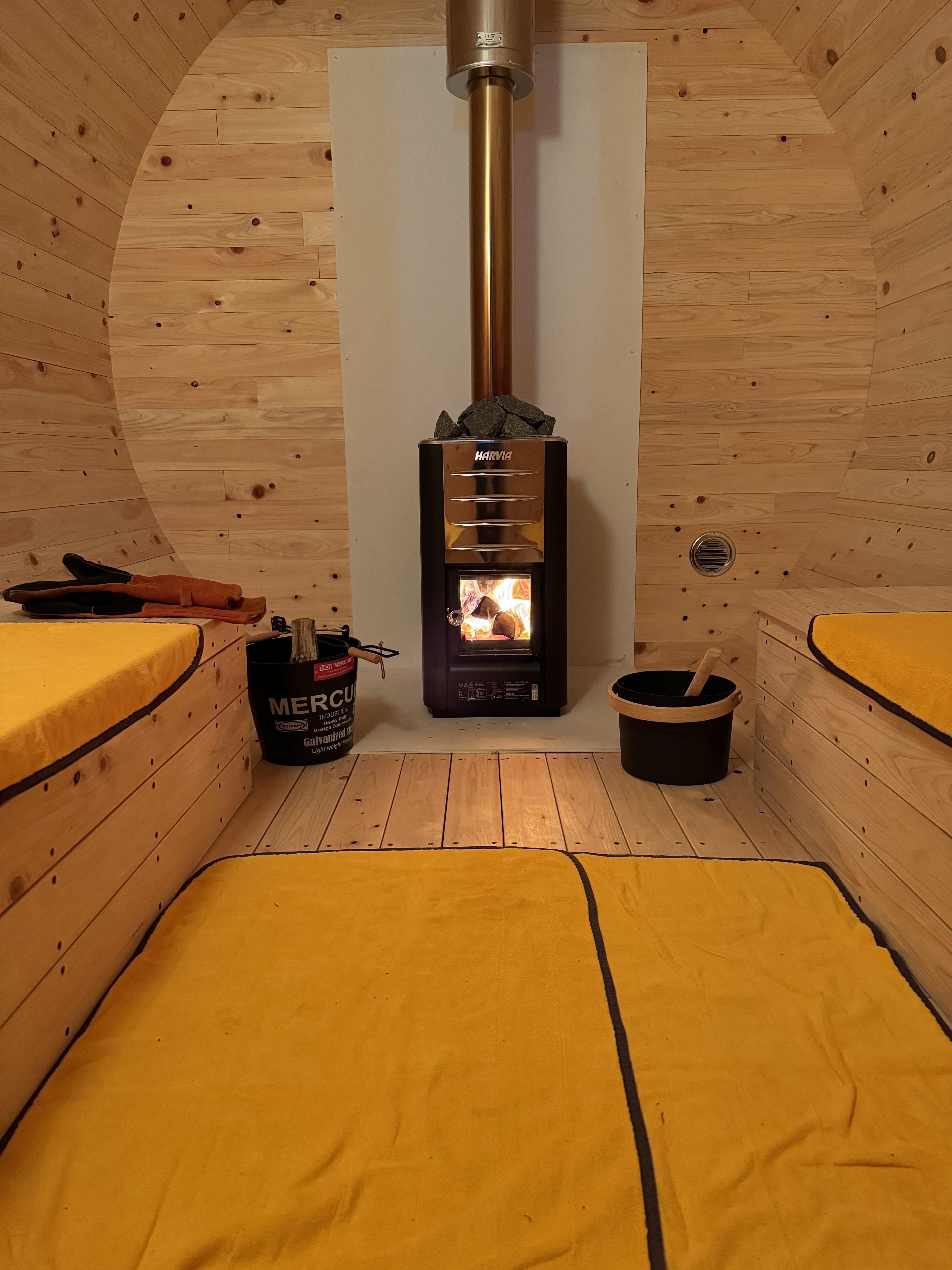 サウナは薪ストーブを使いますので、お客様自身で薪をくべたりロウリュをしたり出来るようにします。