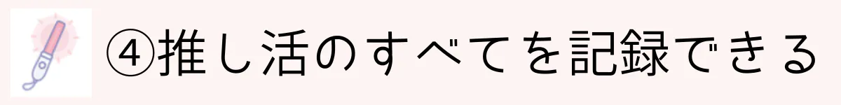 推しとの想い出や、活動記録を大切に残したい方。写真や文章、動画などを記録することができる「ノート機能」で思い出を保存。いつでも見返せます。