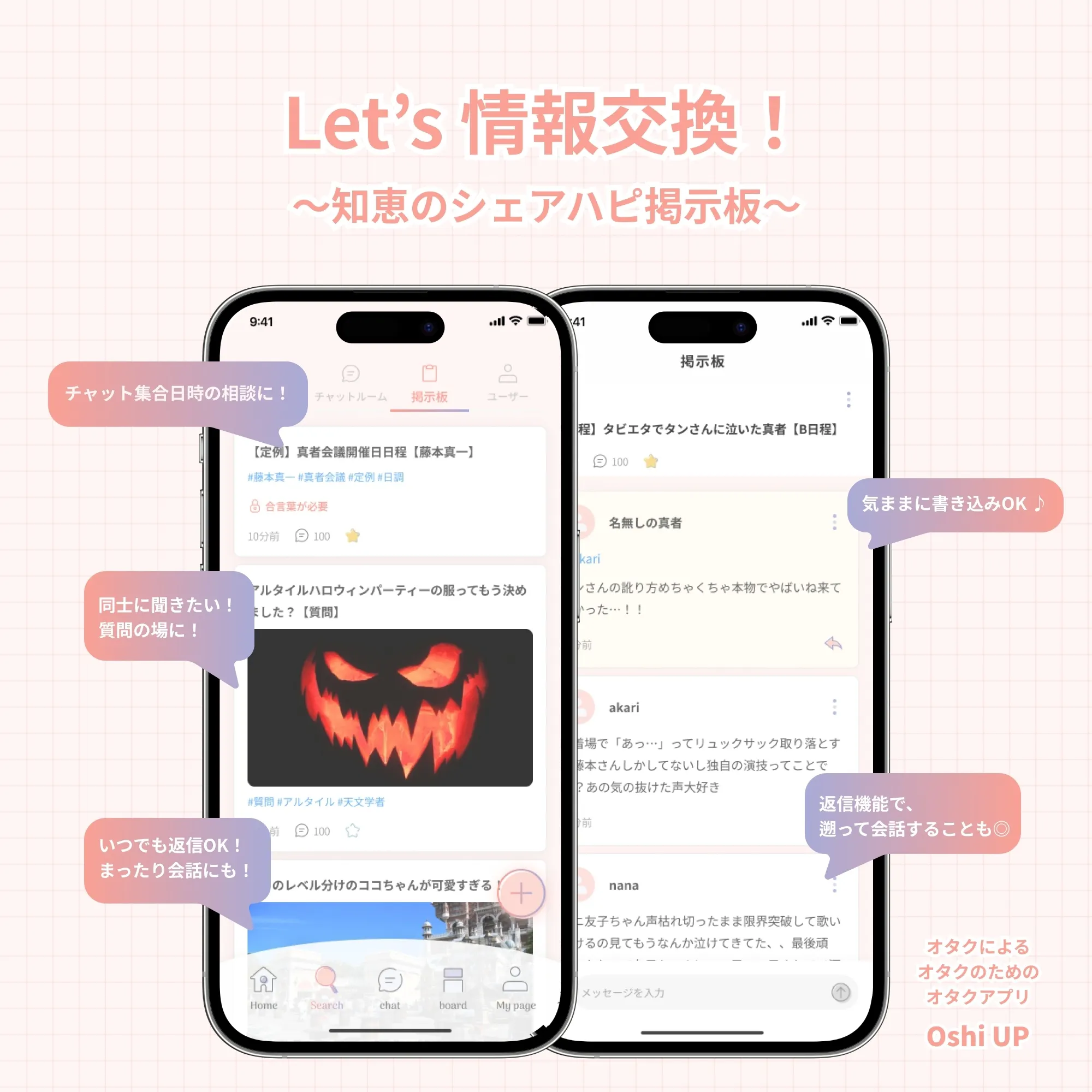 推しの出演する番組や、ライブ情報などの共有、気軽に募集したい質問、推しに関するクイズ、チャット集合日時の相談など、掲示板で推しの最新情報をゲットしよう!
