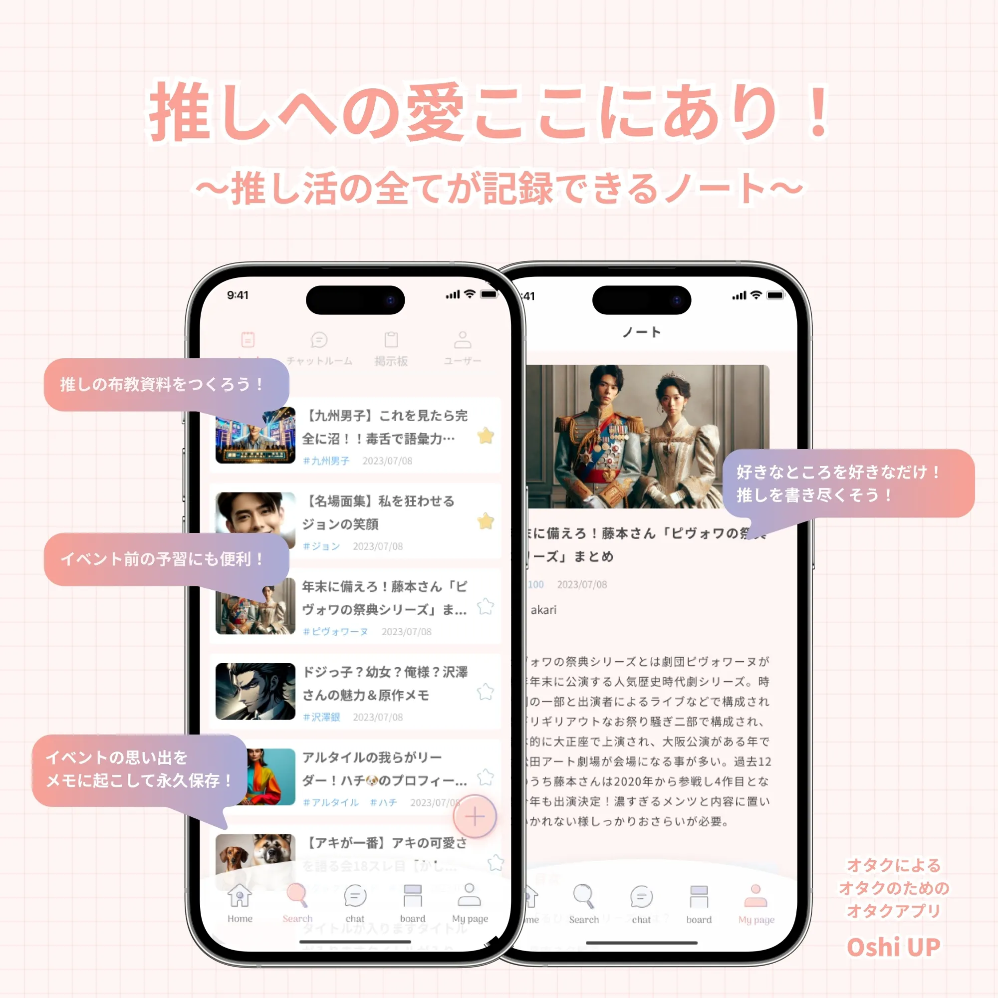"推しデジタル祭壇"を作ったり、推し活を記録したりなどの"自分だけの推し活"も、推し友と語ったり、情報交換をしたり、布教したりと"みんなとの推し活"も両方楽しめます!