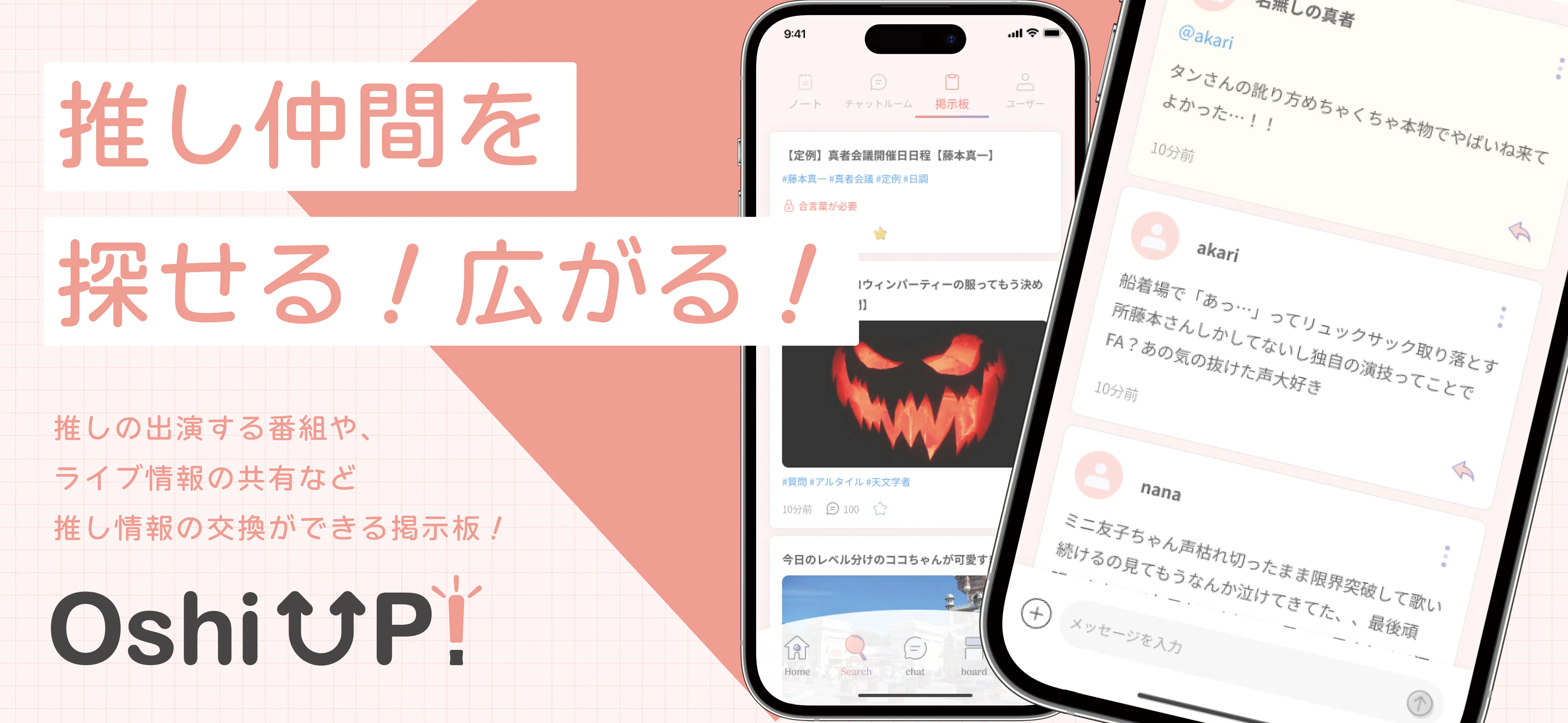 「推しUP!」では、推しの名前でユーザーやチャットルーム、掲示板を探すことができるため、情報も見つけやすく、他の人の目を気にすることなく好きなだけ推し活に没頭することができます。