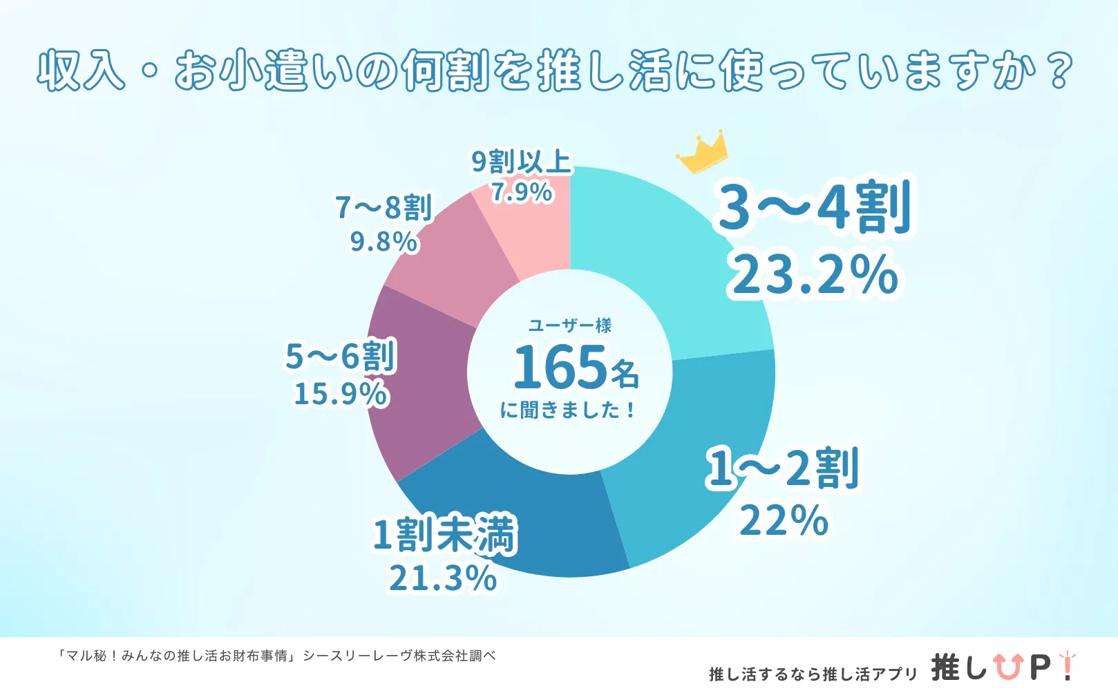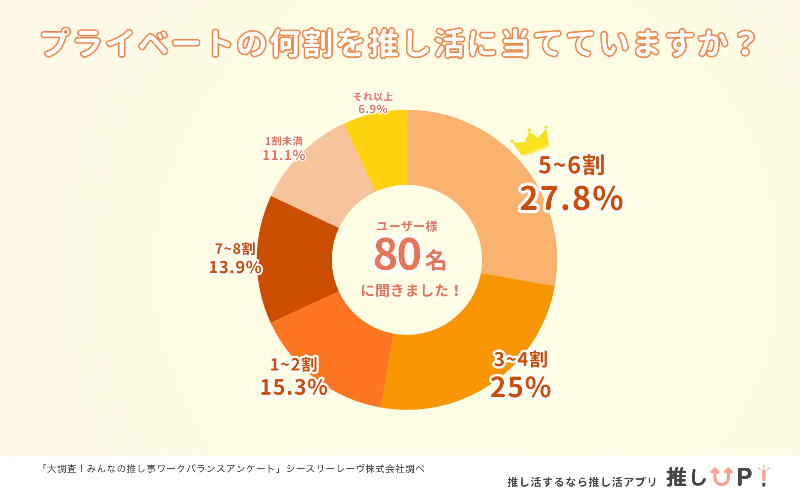 弊社で行った「みんなの推し活お財布事情アンケート」では、収入、お小遣いの5割以上を推し活に使っていると回答した人が33.6%、「推しごとライフワークバランスアンケート」ではプライベート時間の5割以上を推し活につかっていると回答した人が最も多かったです。