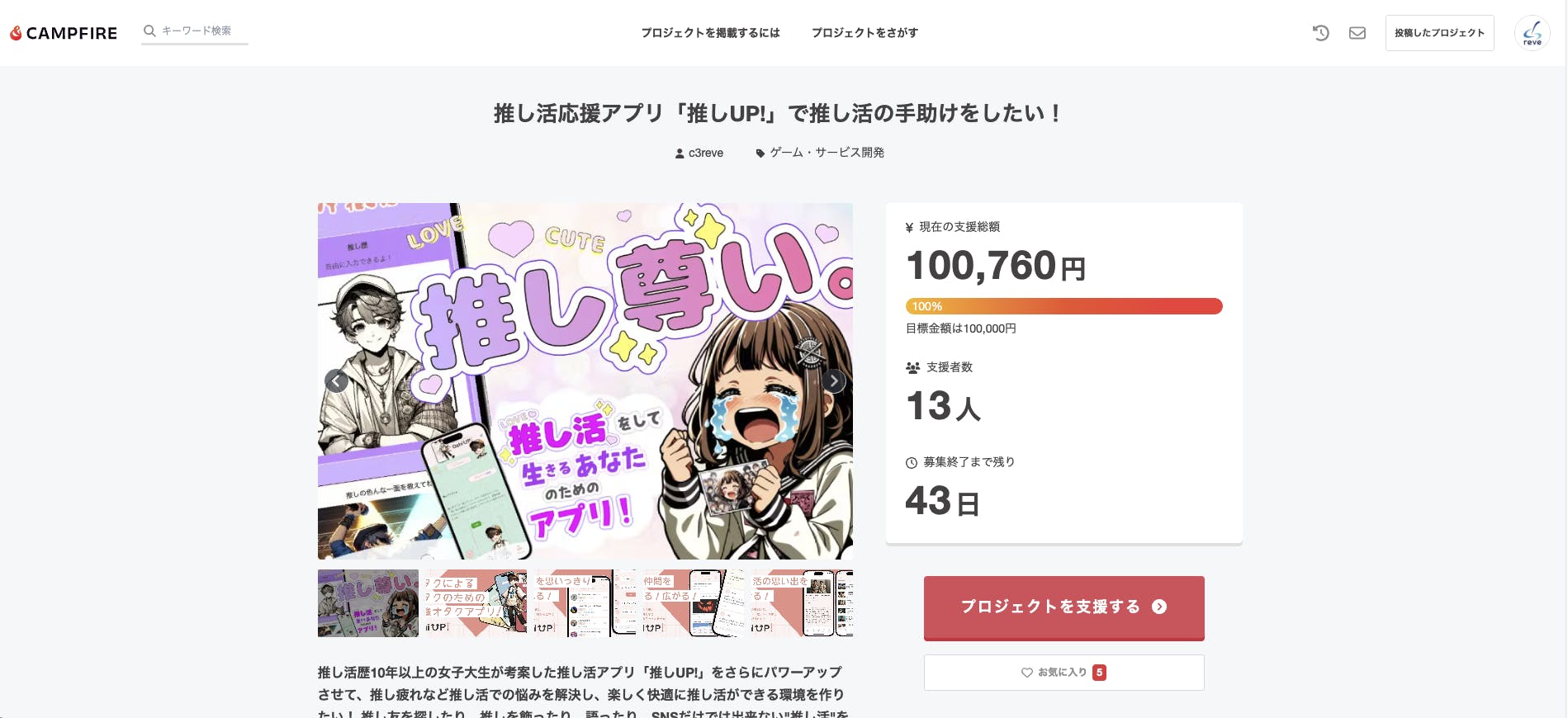 2024/10/18 16:14皆さま、応援ありがとうございます!推し活応援アプリ「推しUP!」のクラウドファンディングが、なんと3日間で目標金額100%を達成いたしました!皆さまのあたたかいご支援のおかげです。本当にありがとうございます!この感謝の気持ちを忘れずに、より良いアプリへと成長させていきたいと思っています。そこで、目標をさらに上積みし、ネクストゴールを15万円に設定させていただきました。この追加資金は、アプリのさらなる機能拡充や、より多くの方に「推しUP!」を知っていただくための広報活動に活用させていただきます。15万円という金額は、皆さまからいただいたご支援にさらに磨きをかけ、より多くの推し活を楽しむ方々に貢献できる、そんな想いを込めて設定した目標です。皆さまのご支援が、より多くの推し活仲間を繋ぎ、充実した推し活ライフの実現に繋がると信じています。皆さまの応援が私たちの原動力です!引き続き「推しUP!」へのご支援をよろしくお願いいたします。 もっと見る