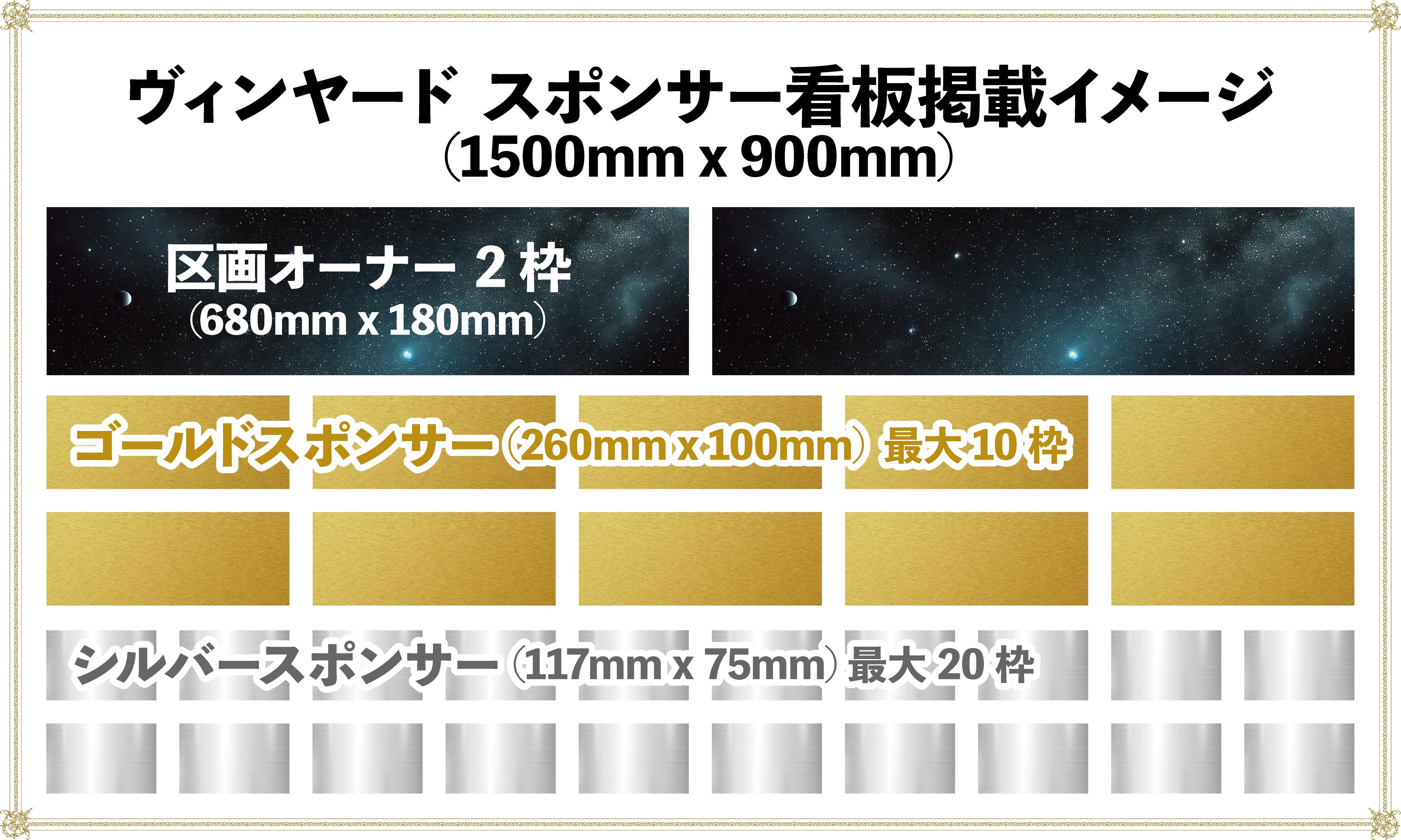ヴィンヤード(ブドウ畑)へのスポンサードになります。現地での看板ほか、ウェブサイト(企画中)等にもスポンサーとして「個人名または団体・サービス名」を掲載致します。