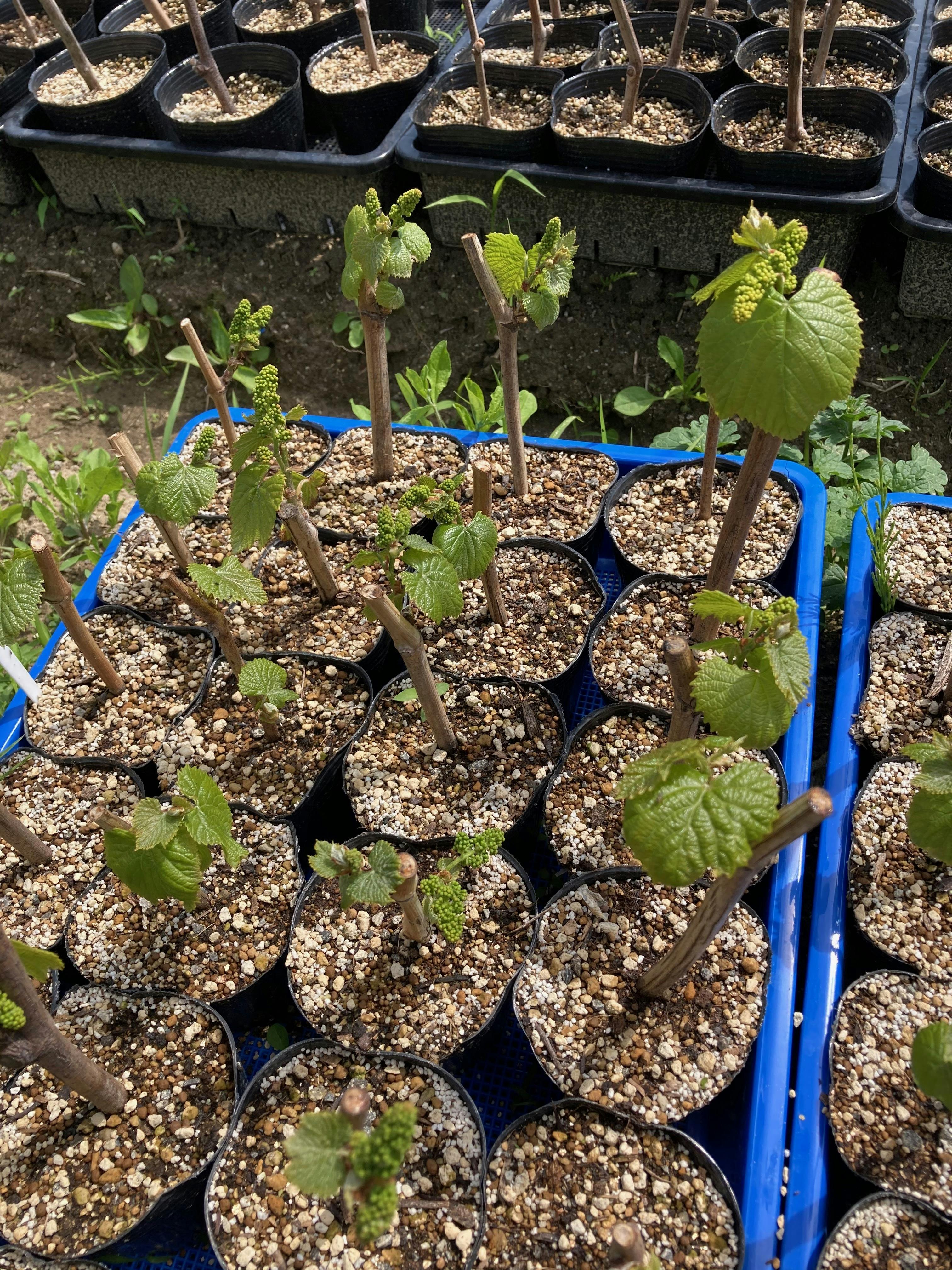 持って帰ってきた枝をお店の常連さんの畑の片隅を借りて挿し木で勉強用に育て始めたのが私のブドウ栽培の原点です!研修で学びながら発芽して元気に育つ苗の手入れをする日々は大変だけど楽しい日々でした!畑を貸して下さった常連さん(枝が多すぎる時は車で運んで下さり)ありがとうございました!