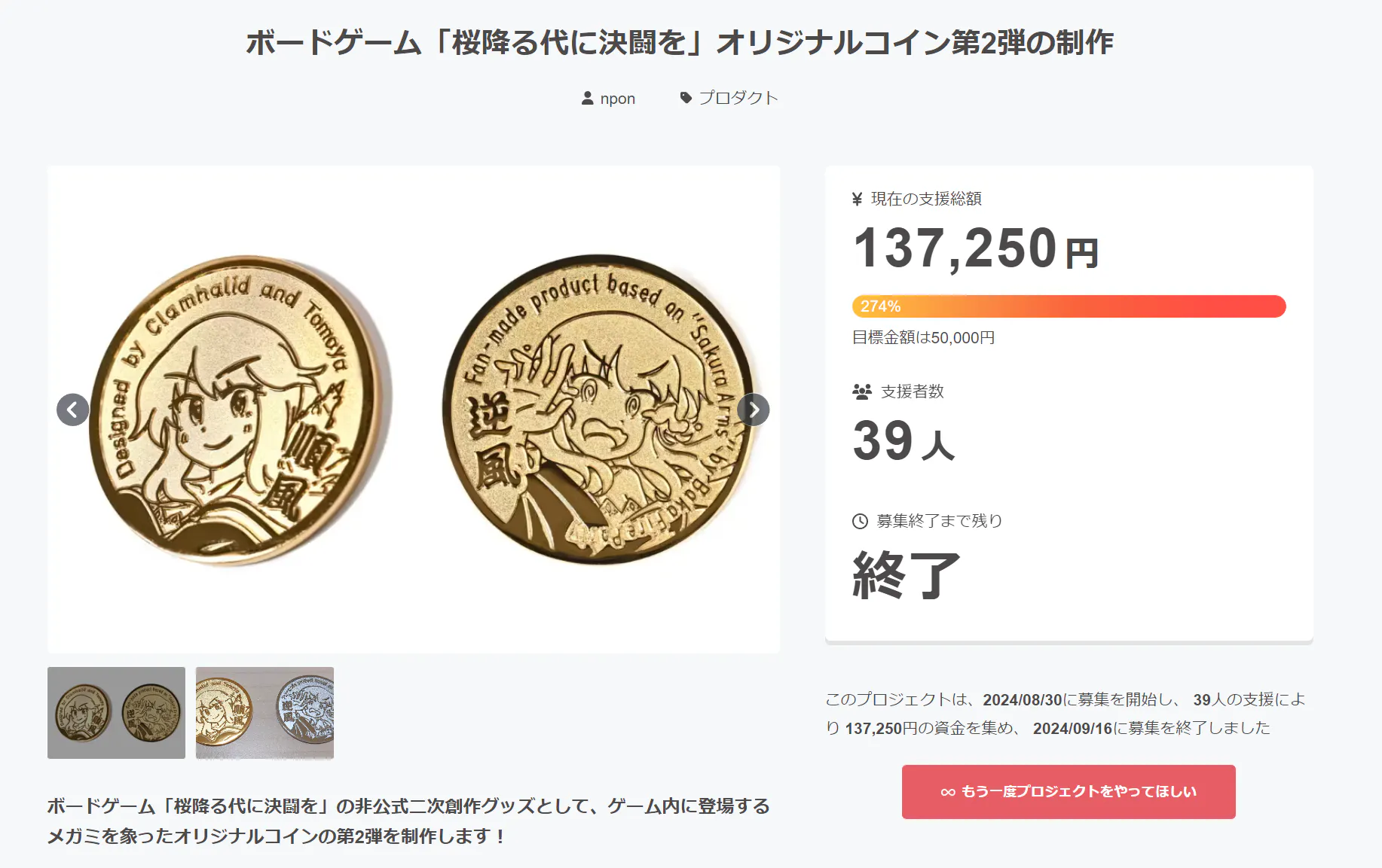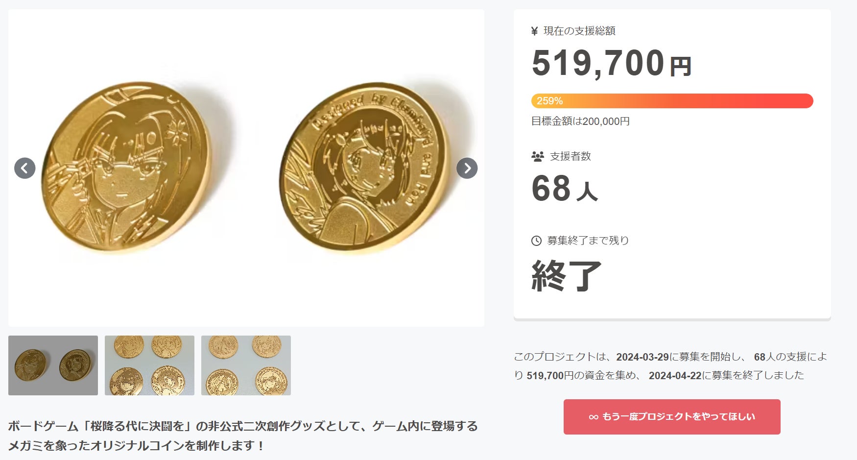 ボードゲーム「桜降る代に決闘を」の非公式二次創作グッズとして、ゲーム内に登場するメガミを象ったオリジナルコイン(メダル)を制作するプロジェクトです。