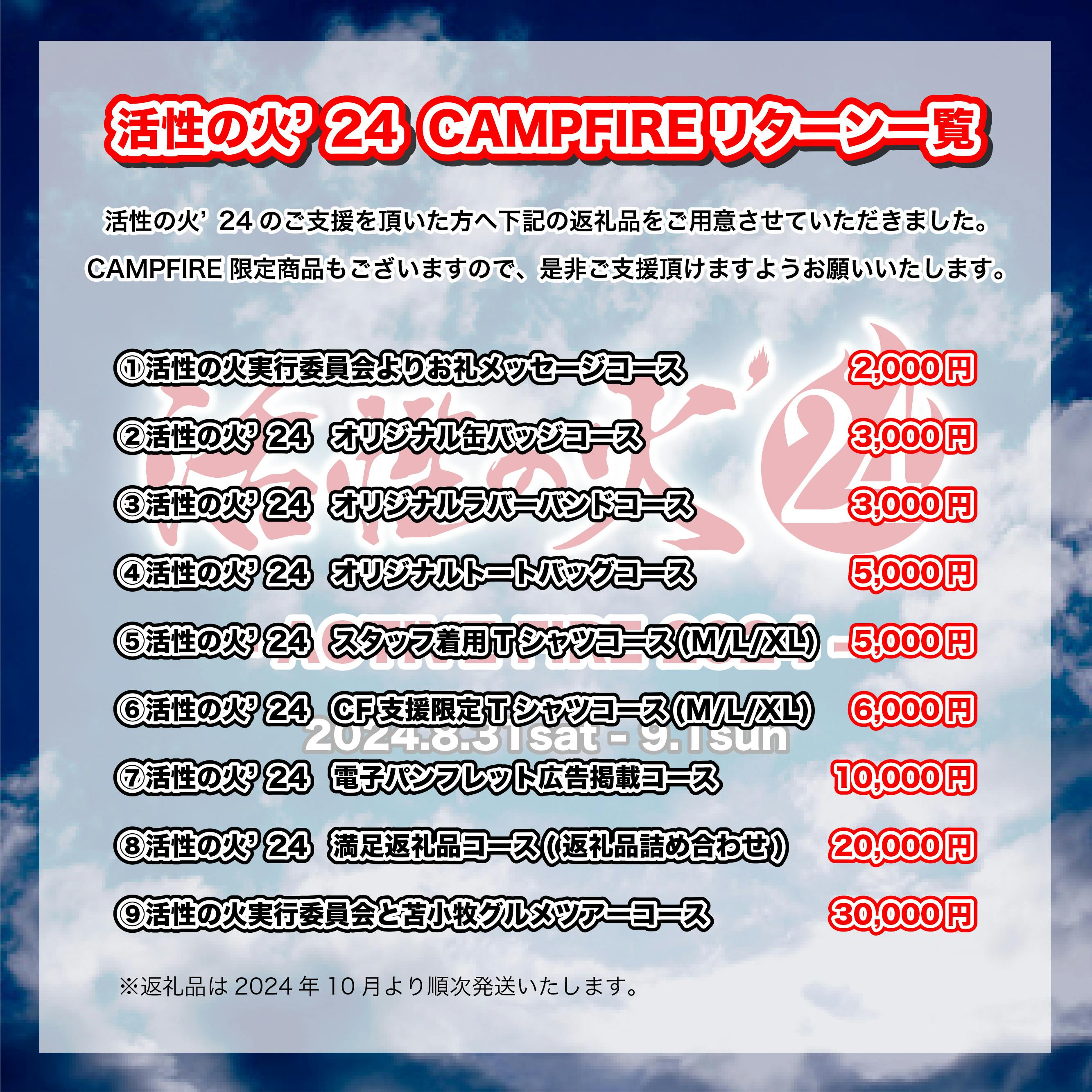 活性の火'24開催のご支援をいただいた方へ下記の通りリターンをご用意させていただきました。