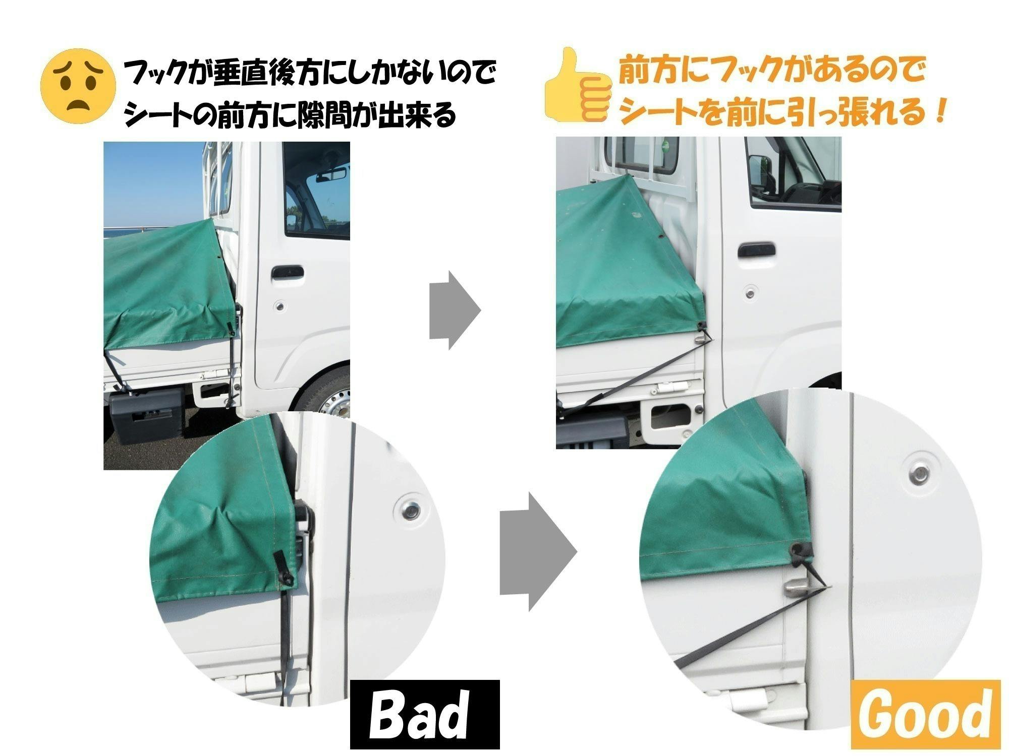 ・軽トラックのシートを張る際に、運転席側の前の方にフックが無いので、シートを運転席側に引っ張ってゴムベルトを留めが出来ませんでした。どうしても隙間が出来てしまいます。このフックはそれを極力解消し、その不満を解消できる製品です。