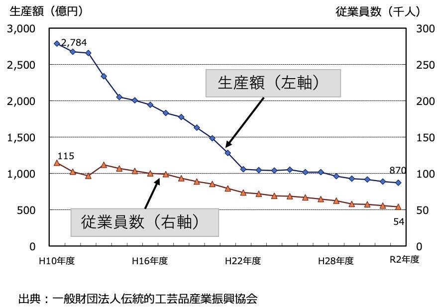 安価な類似品の流入、近年の生活様式の変化により、伝統工芸品の生産額や従事者数は減少傾向にあるとされている現状です。