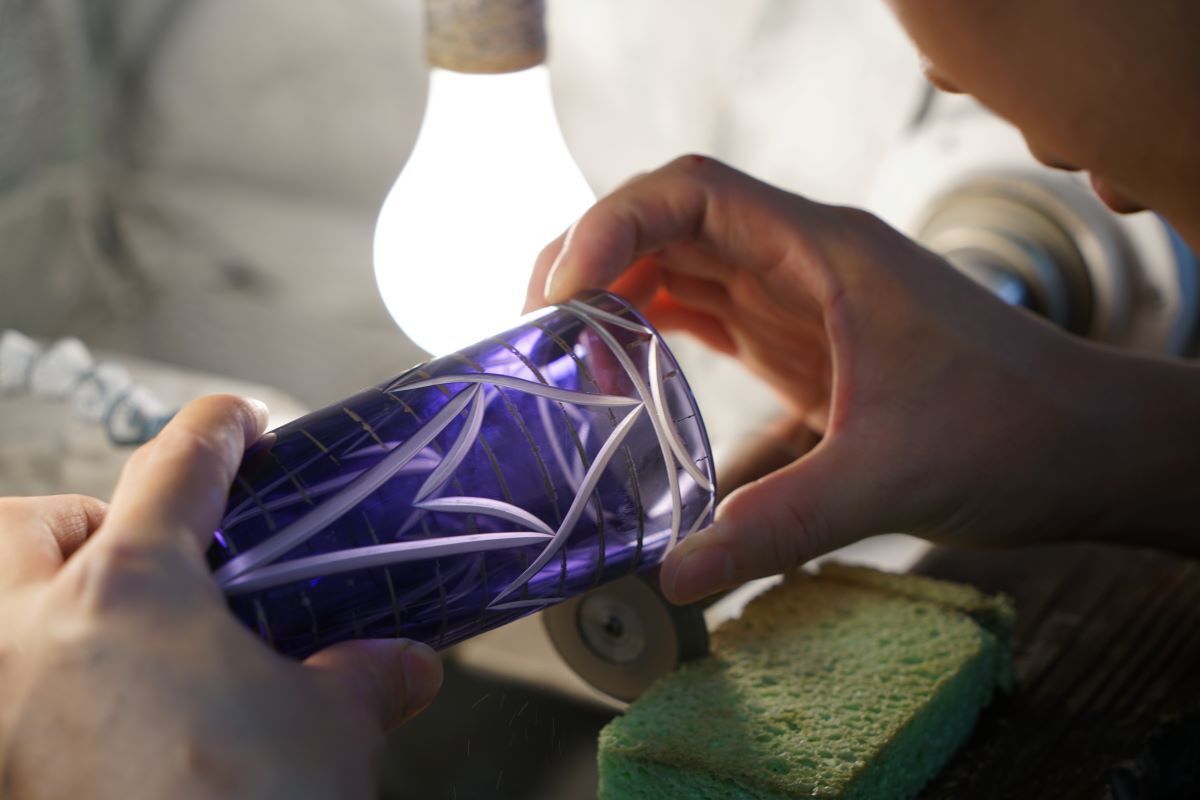 江戸切子の伝統紋様「菊繋ぎ」を施し、花束をイメージした作品『祝華』。タンブラーの形状は飲み物を選ばず、生活に馴染みながらも花束のデザインが日常を彩っていく。