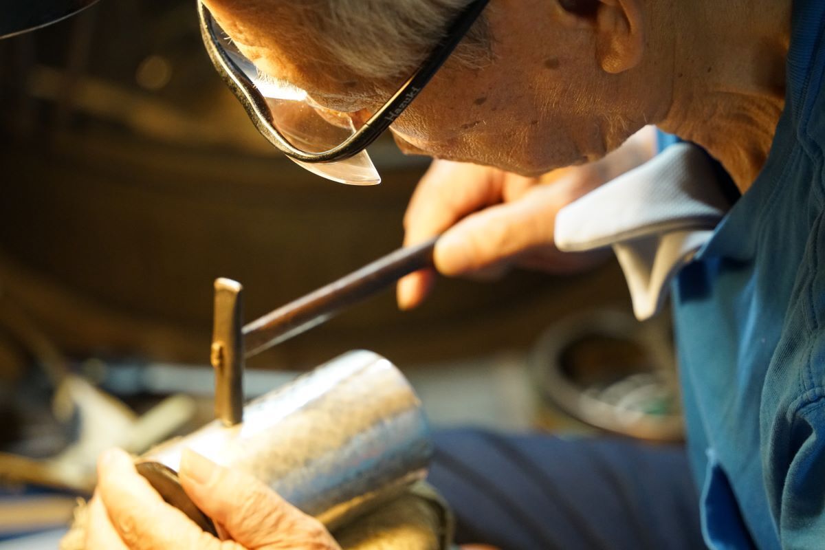 今回のカップのような真っ直ぐのモノを制作するにあたっては、傾斜がかからないように慎重に進める必要があります。また鍛金(金槌で叩いて形状を変える)の工程において、逆絞り(底が自分の方に向いている)技法を用いながら、一つ一つ丹念に叩かせて頂きました。一枚の銀板を金槌で叩いて叩いて鍛え上げた銀製品は美しく、手入れよく使い込むほどに美しさが増して行くると言われております。金のような派手なきらびやかさはないですが、銀の深い味わいを知っていただければと思います。