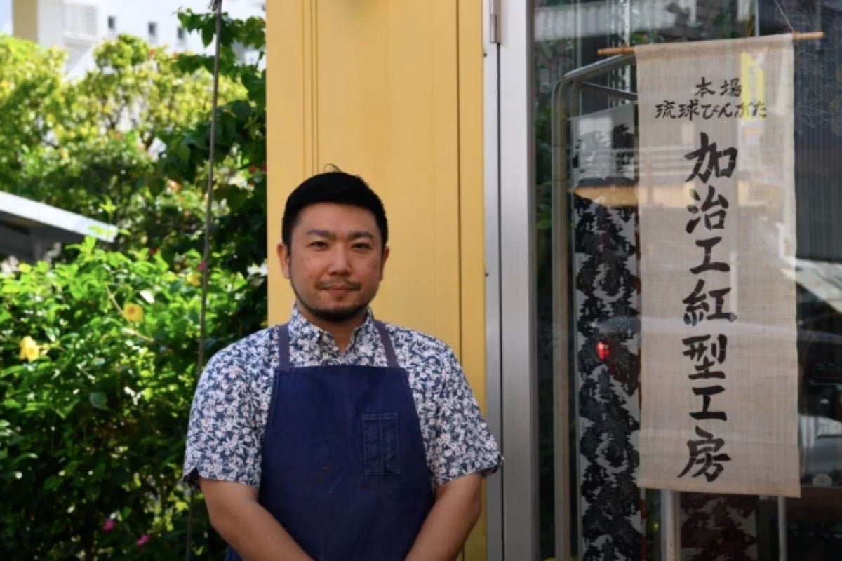 琉球紅型の技法、型染めによる型紙を用いた製作です。芭蕉畑に吹き入るそよ風を、古くから受け継がれている文様でアレンジ。図案・型彫り・染めまでの工程を全て手作業で行っています。素材には芭蕉布を使用。3年かけて育てた糸芭蕉を収穫、そこから糸を取り出して丁寧に紡ぎ、手機で織りあげた貴重な芭蕉布に染めあげております。沖縄の手仕事の掛け算で制作し、南国特有の極彩色の色合いで沖縄の情景を表現しました。