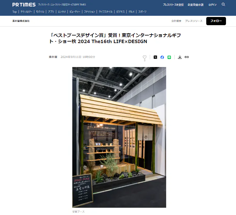 ギフトショーのブースを施工していただいた素朴屋様がPR TIMESに掲載されました。こだわりのデザイン、施工は西会場内でベストブースデザイン賞を受賞しました。