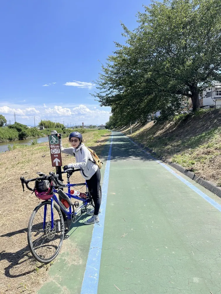 写真11:プロジェクト起案者、竹田が自転車道脇で記念撮影
