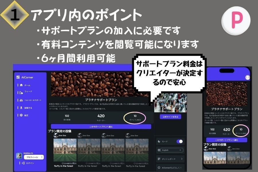 しかし、絵の制作には時間とお金がかかります。また、クリエイターを応援しないとコンテンツが充実しません。AiCornerでは、クリエイターがサポーター向けの有料コンテンツを提供することで、その利益を得る仕組みとなっています。