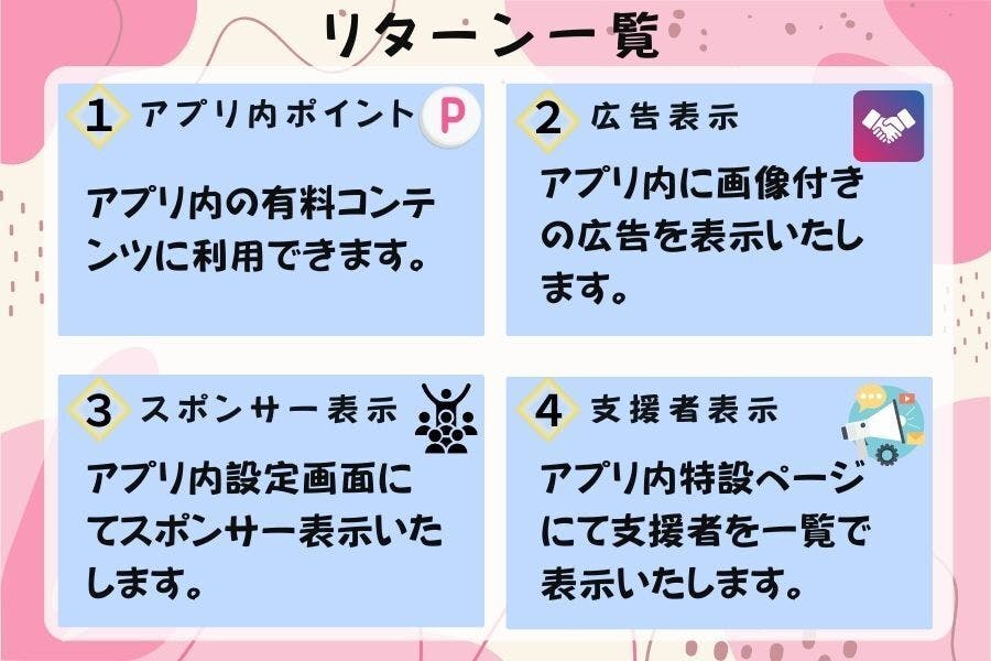 ・アプリケーション内の特設ページにて支援者表示いたします。