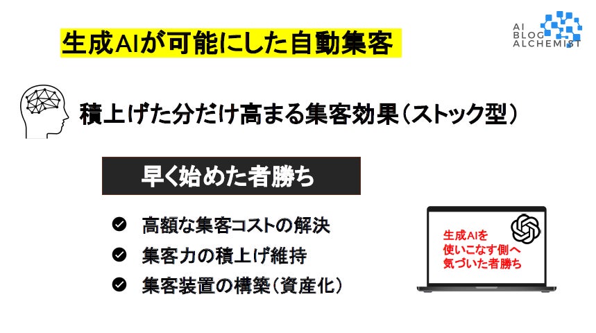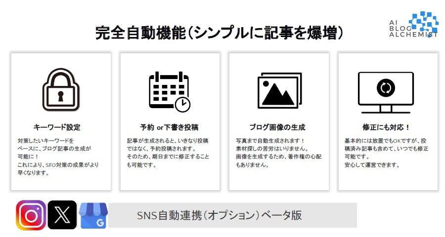 AIブログアルケミストは、そんな方のための生成AIを使ったWEB集客の完全自動化システムです。