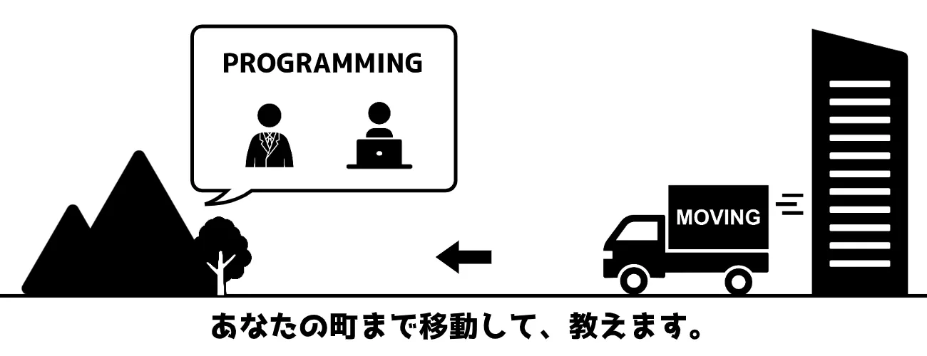 この事業の対象は、中山間部で生活する子ども達(小学生~中学生)で、決まった日時に該当エリアへ移動します。なお、各家庭の負担を鑑み、プログラミングで使用するデバイス機器は塾側で用意します。