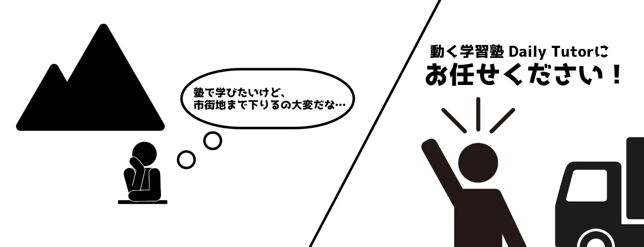 この事業は、講師が中山間部で生活する子ども達のもとへ赴き、地域の公民館等の一室を借りて学習を提供する、移動スーパーならぬ「移動型学習塾」です。