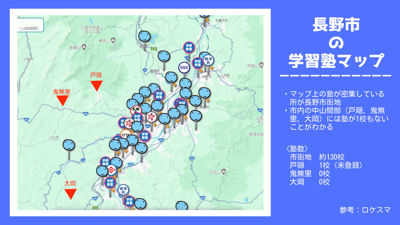 私が長野市内の学習塾でアルバイトをし、多くの子ども達の学習事情の話を聞く中で、長野市内のエリアによって学習塾の数、教えている教科などに偏りがあることに気が付きました。