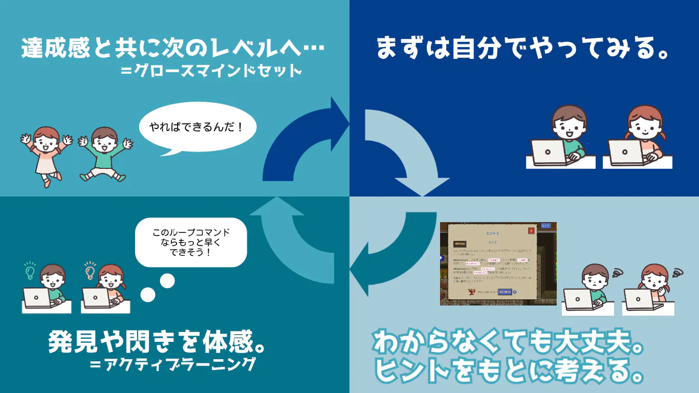 プログラミング教育を通して身に着ける「アクティブラーニング」と「グロースマインドセット」の促進を目的としています。