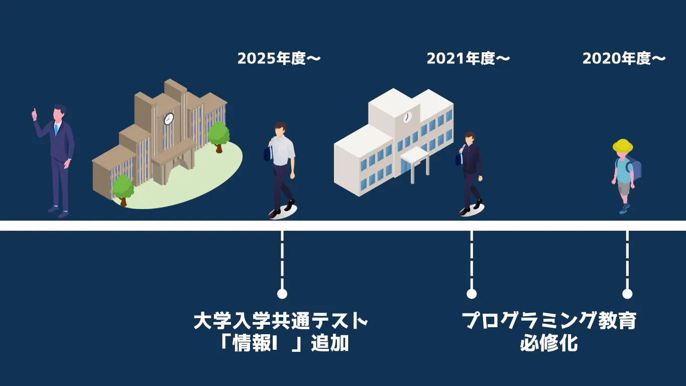 また、2025年度から大学入学共通テストに「情報Ⅰ」が追加されることとなり、小・中・高の子ども達は、これからの進路に進むうえでプログラミングは必須といえる状況となりました。