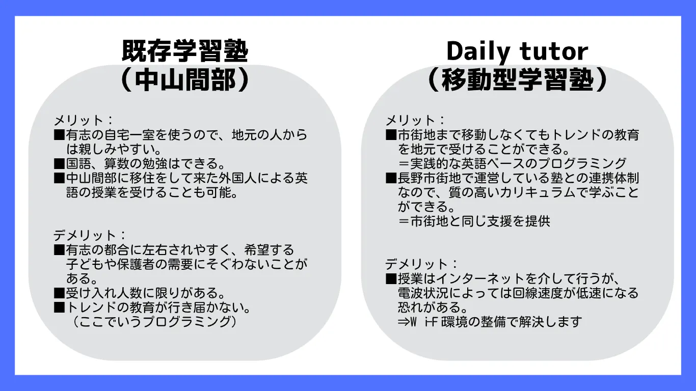 また、中山間部の1校に関しても地元の有志によって自宅の一室を活用して行っているものであり、定期的な開催が見込まれていません。実際に5月に訪れた際にも学習塾の看板を掲げている施設を確認することはできませんでした。