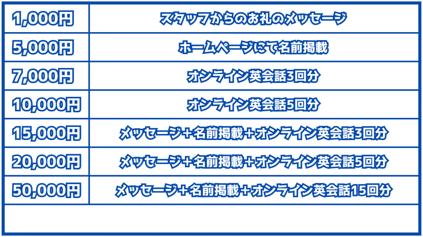 ※「ホームページにて名前掲載」/「名前掲載」については、Daily Tutorホームページ内の協賛者様リストにお名前を掲載させていただきます。(ニックネーム可)