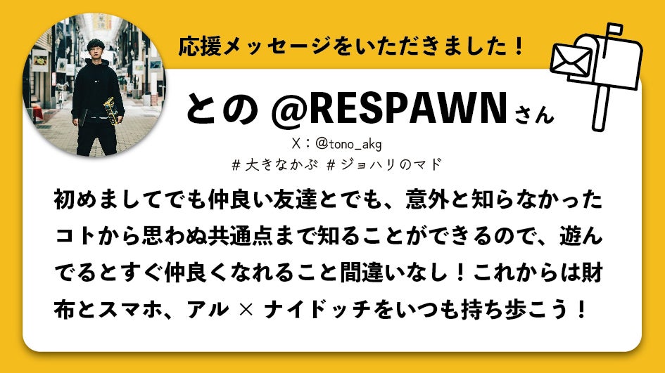 現在自分は横瀬町という町で『地域おこし協力隊』として着任し、ボードゲームを用いて町おこしをしているのですが、とのさんも元々は『地域おこし協力隊』だったという、キャリア面でも先輩の方です。多方面でとても頼りにさせていただいている方です。素敵な応援メッセージをありがとうございます!