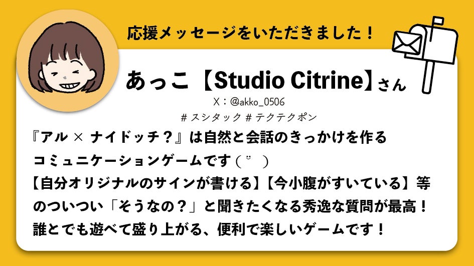 その後度々テストプレイ会に参加した際にお会いし、今作に意見もいただき、今に至るという経緯です。よく伺うシェアハウスの管理をされている方がいらっしゃるのですが、その方に好きなサークルさんはいらっしゃいますか?と以前伺ったのですが、あっこさんのサークルさんを挙げていました。そんな面白くて可愛いゲームを制作される方です。改めまして素敵な応援メッセージありがとうございます!