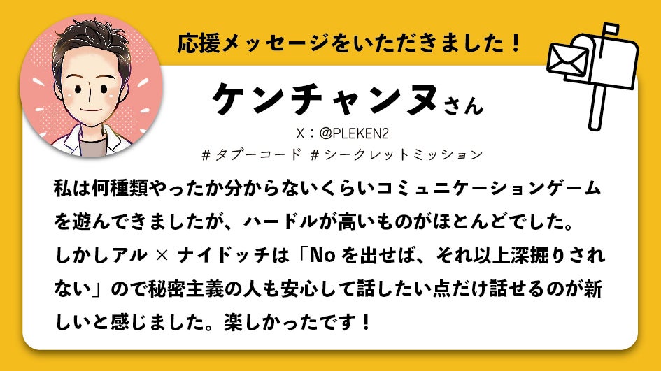 ボードゲームを作り始めた大学時代に、初めてお会いしたゲームの売り上げで生活されていた方がケンチャンヌさんでした。年齢はあまり変わらない中、制作したゲームが有名なYouTuberの方や、朝の地上波の番組で何度もゲームを紹介された実績を持っていて、制作し始めの時は度々相談に乗っていただいた思い出があります。その節は本当にありがというございました。。いつも刺激をいただいています。