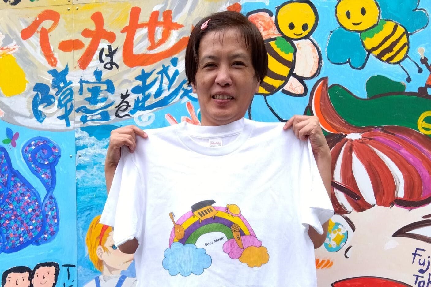 こちらのデザインは虹の上でギター、ピアノ、タンバリン、マイクがそれぞれ自ら音を奏でています。雲が左右で朝日と夕日で色を塗り分けされていて地球全体に音色が届けている様子を描きました。雲の上でキレイな虹と空が広がっている様子に晴れやかな気持ちにさせてくれるデザインとなっています。Dコース④のご支援からお選びいただけますので、どうぞご覧くださいませ。