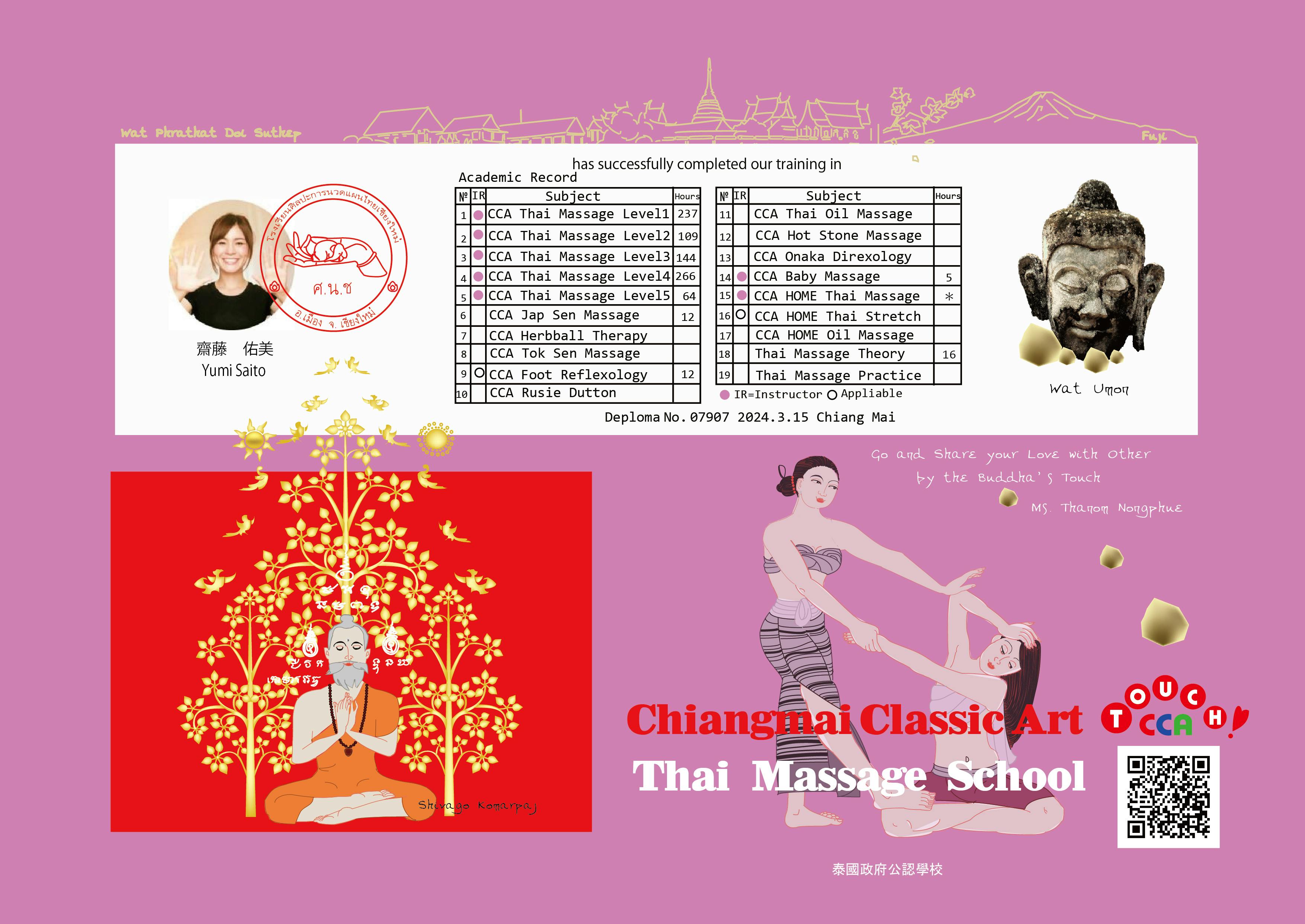 タイ政府公認校「CCA」タイマッサージスクール認定講師歴11年。