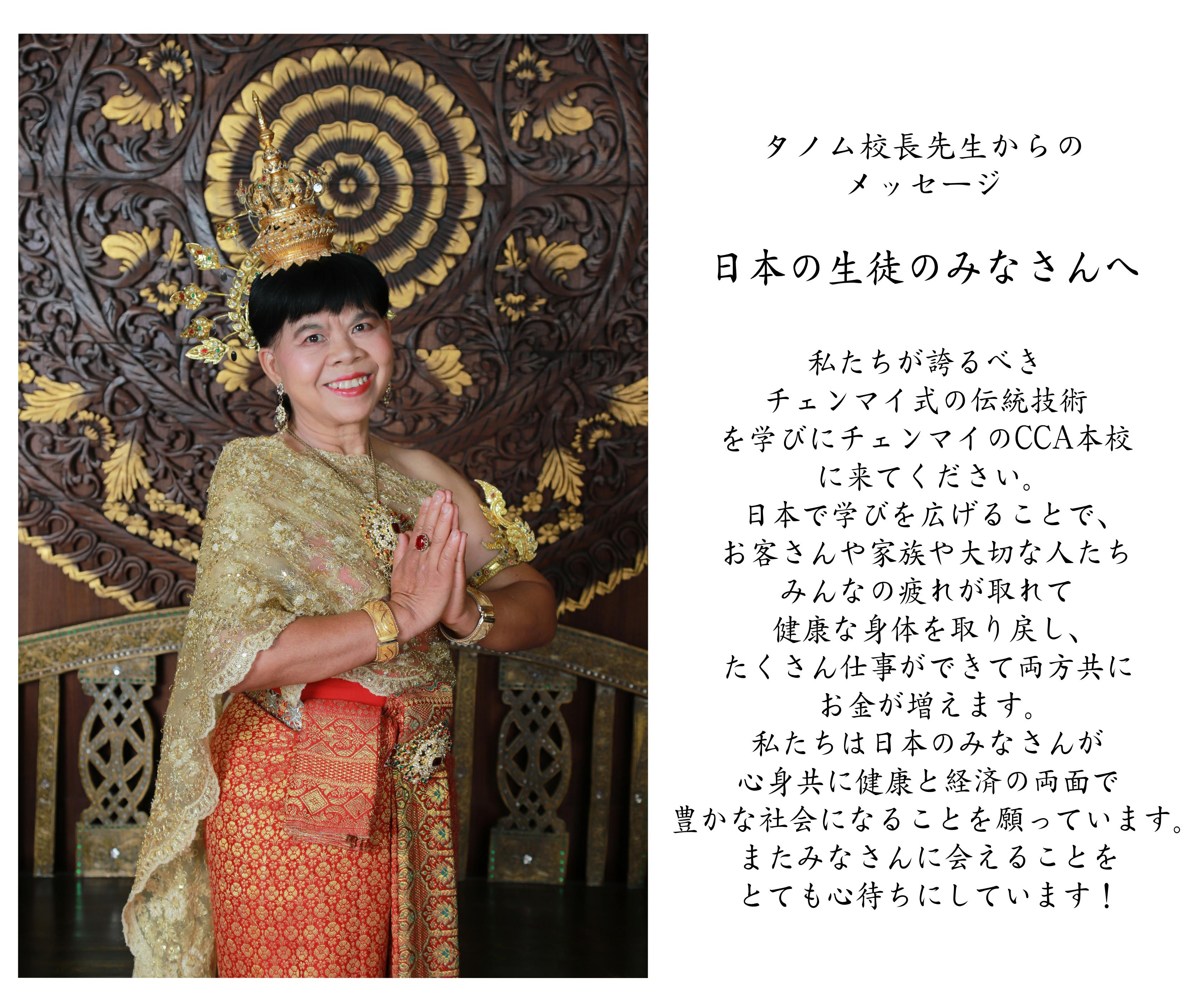 繰り返しになりますが、CCAを再興すること、つまり、本場タイ・チェンマイで20年の長きにわたってチェンマイ式タイマッサージを日本人に伝えてきたCCAの栄光ある歴史を次世代へと繋ぐこと、それが私の願いです。