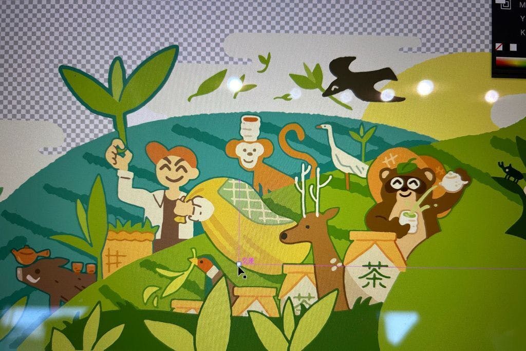デザインBYサラおぶぶの代表アッキーと和束の茶畑、山で出会う動物や虫たちがポップに描かれたデザインになっています。
