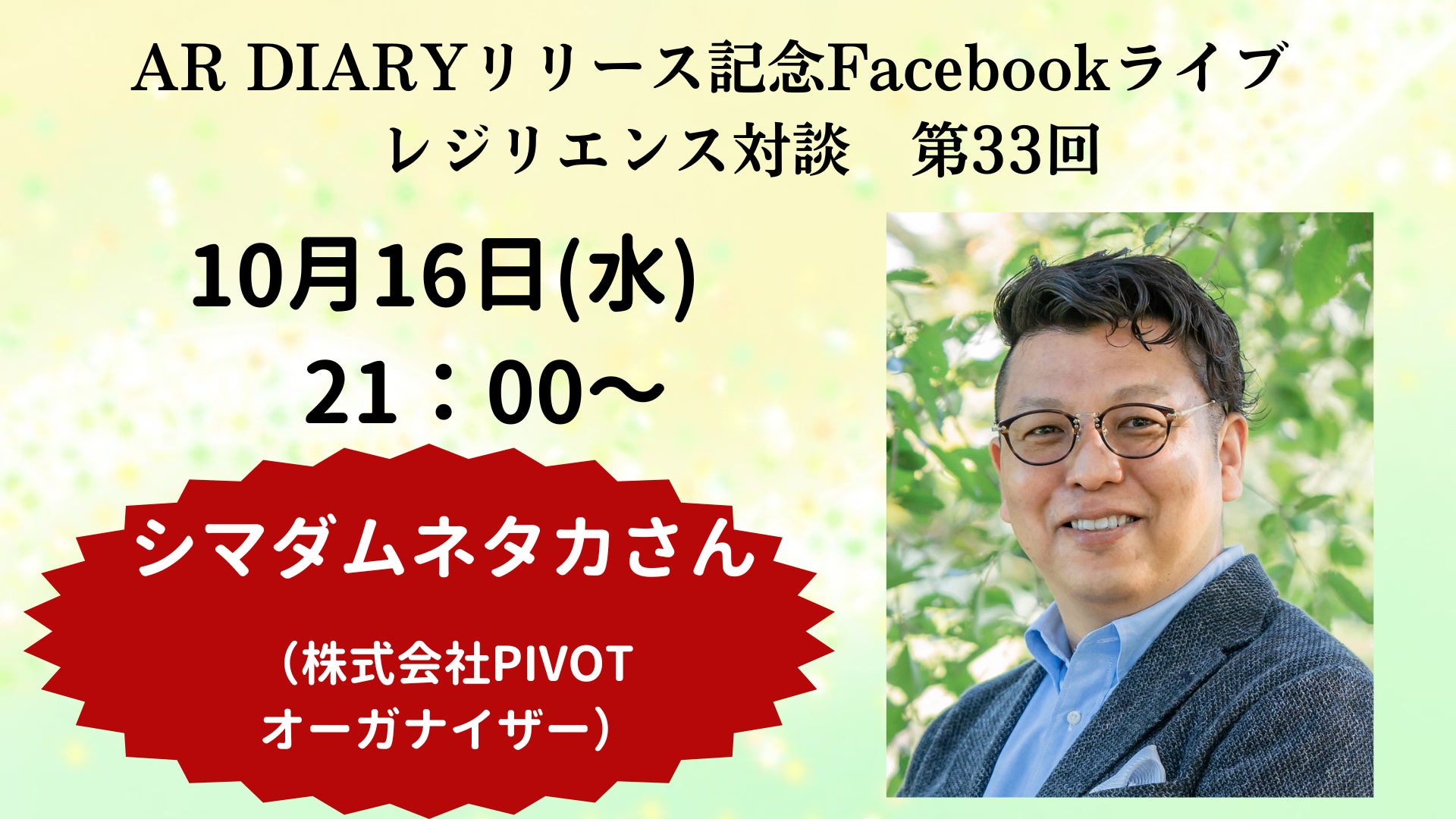 9/10からほぼ毎日、AR DIARYリリース記念Facebookライブを開催しており、毎回多彩なゲストをお招きしてレジリエンス対談をお送りしています。第33回の本日10/16(水)は、21時から、株式会社PIVOTオーガナイザーのシマダムネタカさんをお招きして行います。
