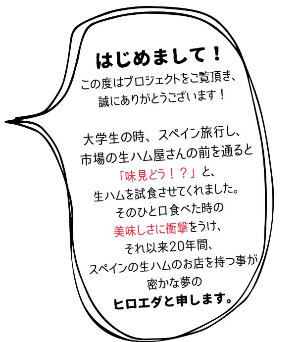 昨年5月に、お店を持つ夢の前に、まずは自分が自信をもって、皆様にお勧めできる生ハムを自身で輸入し、少しでも多くの皆様に食べてもらいたいという目的の元、こちらのキャンプファイヤーでクラウドファンディングをしたところから、この事業がスタートしました。↓↓