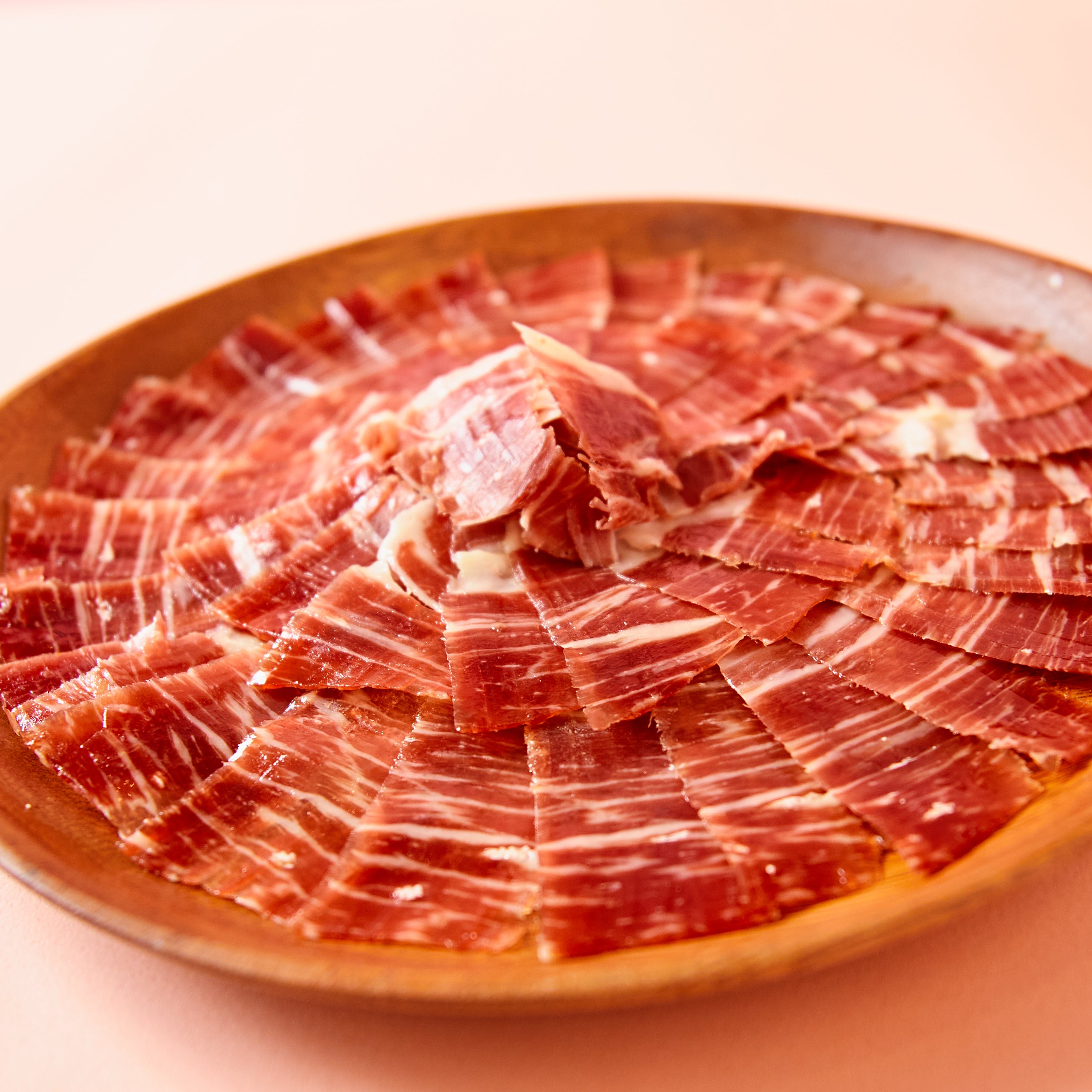 イベリコ豚生ハムの脂の融点が低いため、口の中の体温で、先にイベリコ豚の甘い脂が溶け、その後、噛み応えのある生ハムを噛めば噛むほど旨味が広がり、口の中に生ハムがなくなった後も香りや旨味の余韻が続くので、皆さん、驚かれます!