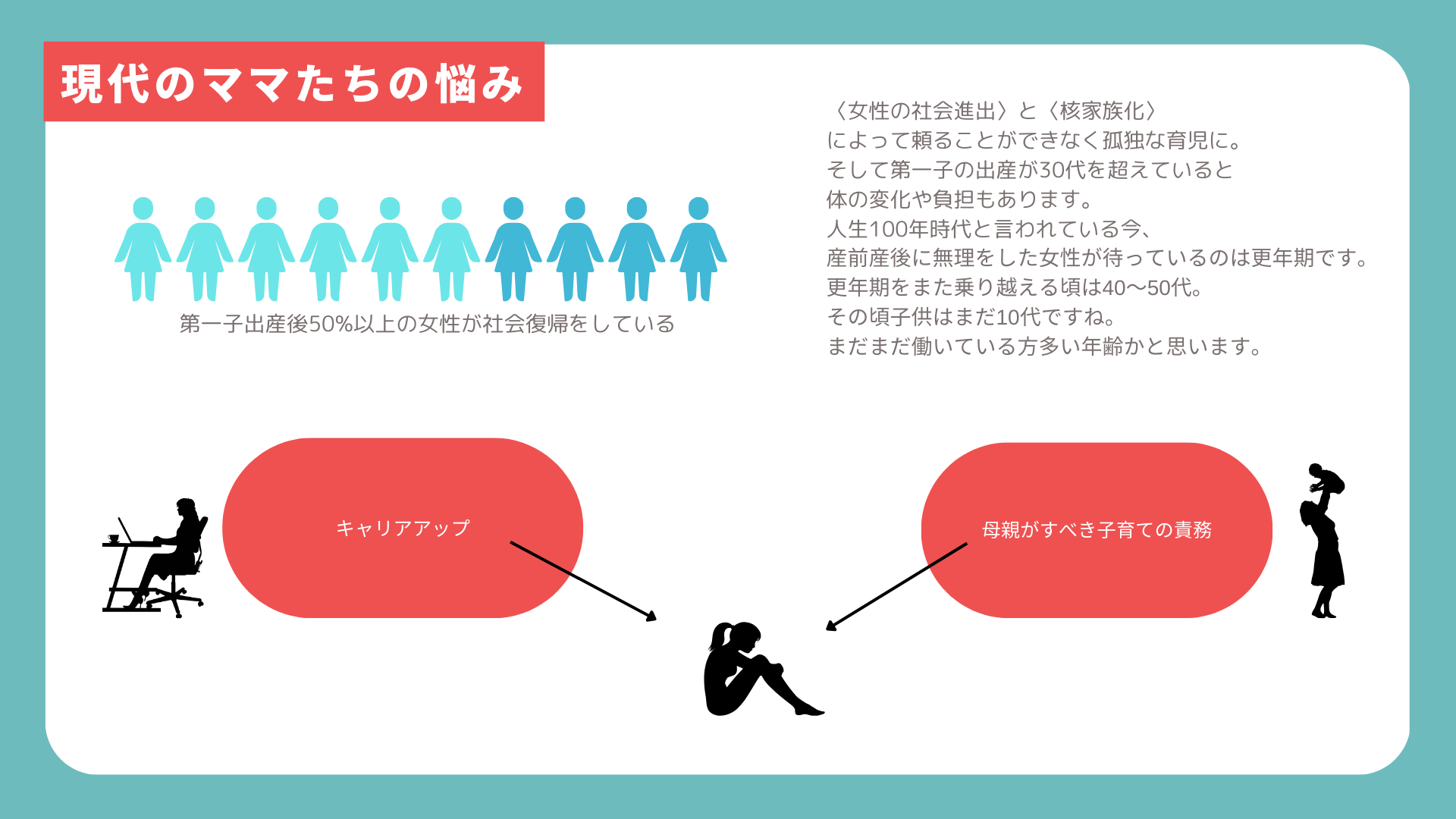 また、多くの世帯が核家族であるがゆえ、精神的に孤独な育児になってしまったり、物理的に子育てのサポートや体力が足りず、結果的に作り上げてきたキャリアをストップせざるを得なくなる方もいます。