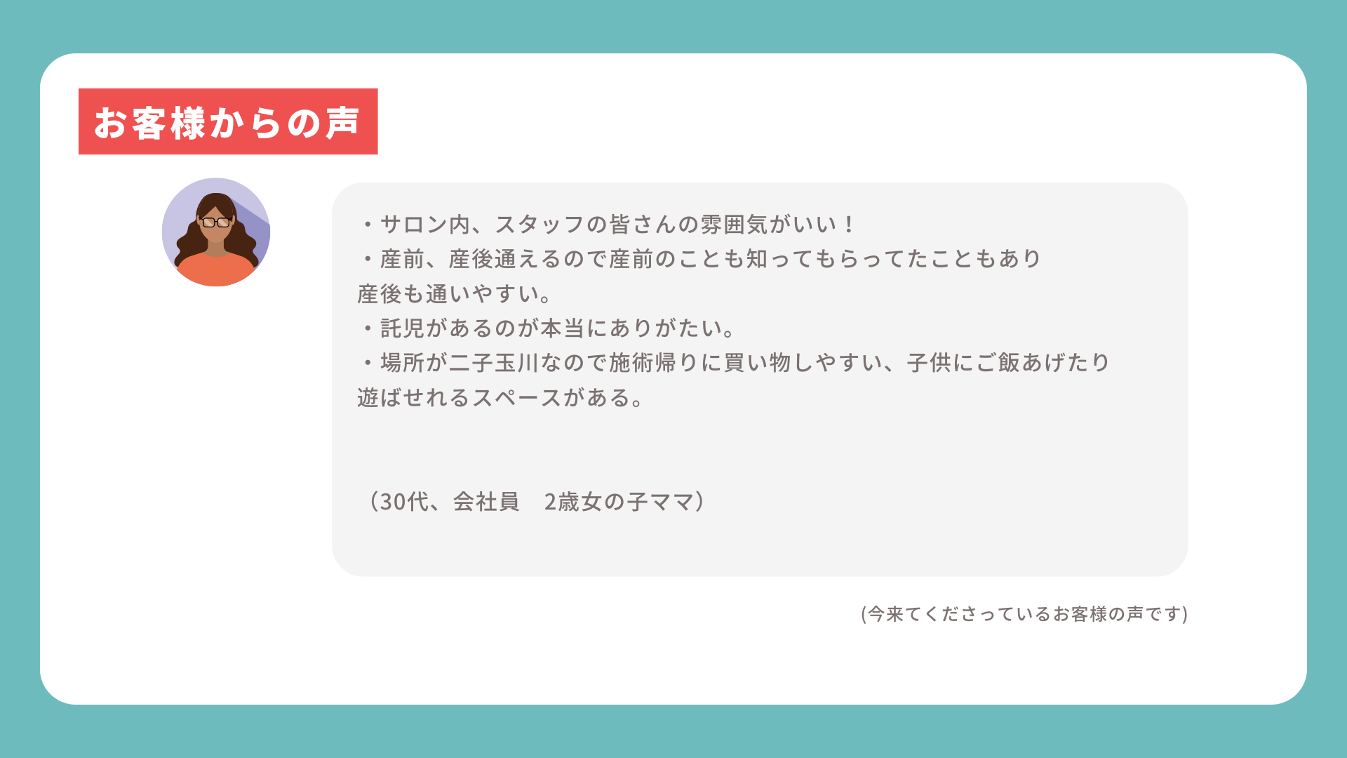・産前、産後通えるので産前のことも知ってもらってたこともあり産後も通いやすい。