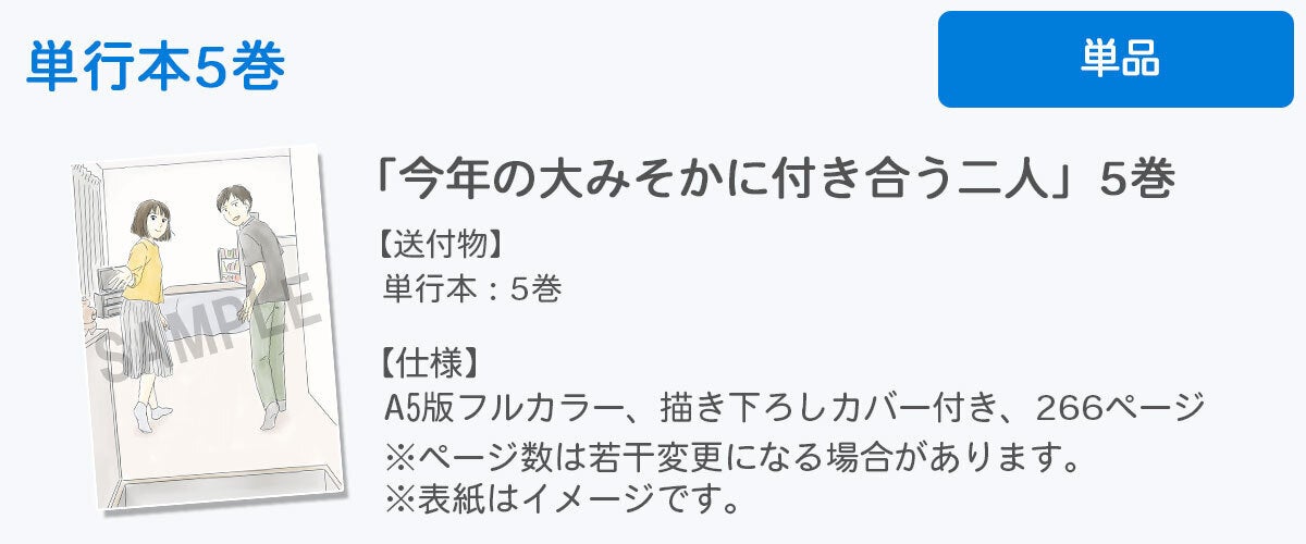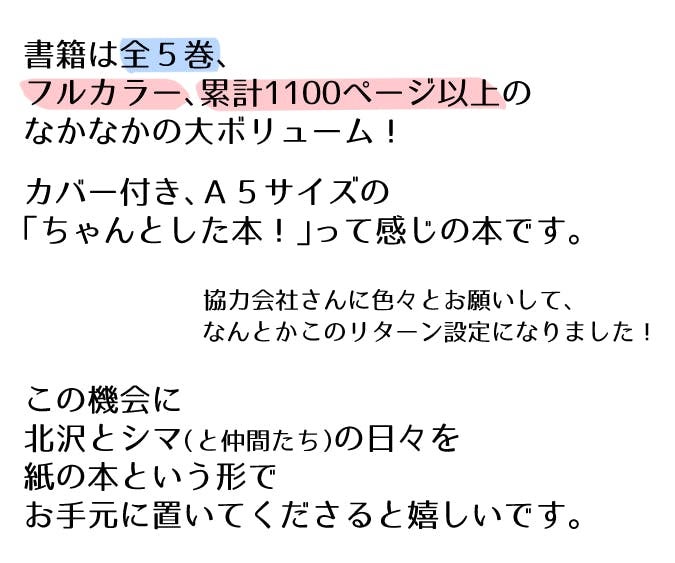 多くの読者様より紙本化を待望する声をいただき、本企画を実施するに至ったことを深く御礼申し上げます。約1,100ページ相当におよぶ本作の単行本化(全5巻)と、ここでしか手に入らない、その後の二人を描いた小冊子 をお届けすることを目指します。