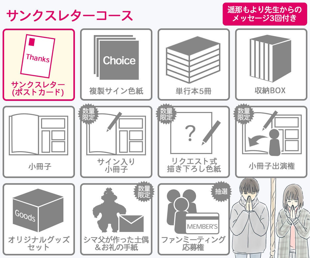 【送付物】・お礼のポストカード×1・メールメッセージの配信×3・単行本1~5巻セット・収納BOX×1・小冊子×1・オリジナルグッズセット×1セット・ファンミーティング応募権